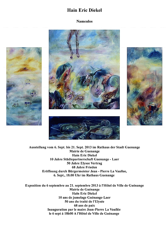 Hain Eric Diekel confronte dans ses toiles, son public la souffrance et la mort. Il ne veut pas " faire plaisir ". Son æuvre ne laisse pas indifférent : on l'accepte ou on la refuse mais, toujours, elle porte à la réflexion. Ses tableaux sont un défi, il faut y faire face. Sous la mince couche de peinture en surface, s'en cachent d'autres, successives, tout aussi nombreuses que les contenus. Leur seule perception visuelle ne suffit pas : cette œuvre exige un engagement spirituel intense, une identification dénuée d'a priori. La peinture de Hain Erich Diekel est figurative. Il va son chemin sans s'occuper des modes éphémères. Ce n'est pas l'innovation artistique qui l'intéresse tout d'abord ; il puise plutôt dans le très riche fonds des formes que recéle l'histoire de l'art pour créer le monde des images qui est le sien et il se sent plus attiré par les réalisations picturales d'un art ancien que par celles de la modernité.